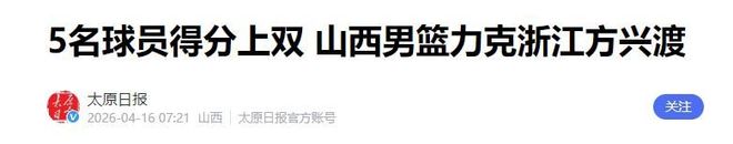 资料来源:《太原日报》2024年3月15日刊发报道《五人得分上双 山西男篮力克浙江广厦》
